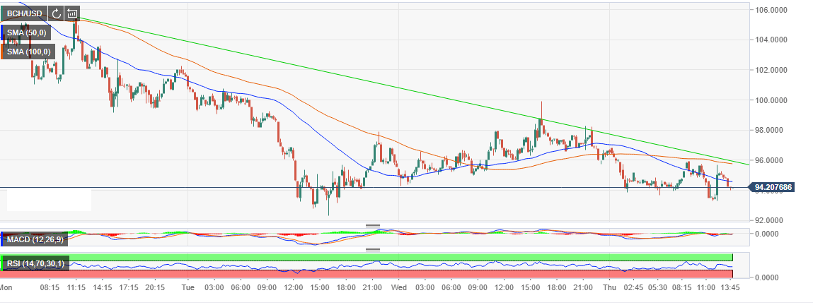Bitcoin Cash continues to test the levels towards $90.00 following the failure to stay above $100. The asset was recently added to Gemini exchange but the support did little to change the current downward spiral trend. There was correction above the 15-minutes moving average during the trading yesterday where Bitcoin Cash stepped above $99.00. However, the buyers lacked a catalyst to sustain the price above $100.