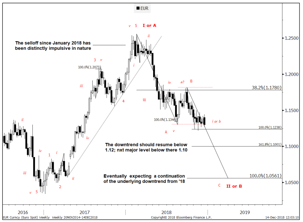 Everything down to the Aug. ’18 low was impulsive in nature. From August into year-end, the market entered a corrective phase, one that retraced/has so far held 38.2% at 1.1780.