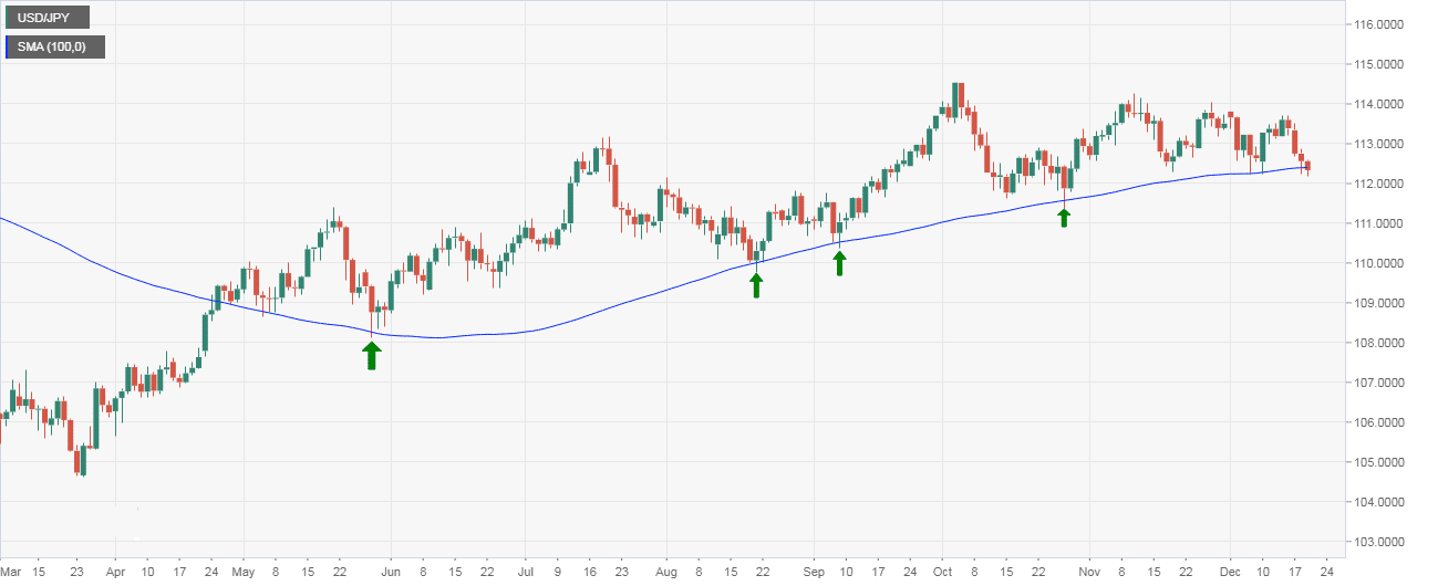 The USD/JPY bulls need to defend the 100-day moving average (MA) on a daily closing basis, else a deeper drop to levels below 110.00 (psychological support) could unfold in January.