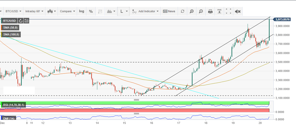 Looking at the hourly chart of BTC/USD, we see Bitcoin flirting with $3,970. As predicted in the market update piece published earlier today, Bitcoin has not only re-entered the rising channel, it is also battling to overcome the resistance at the upper trendline. A break above the channel support will definitely ignited gains above $4,000,