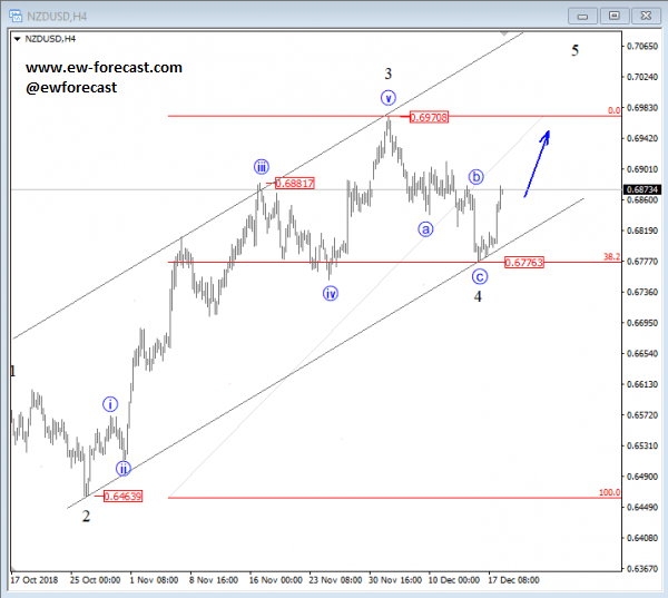 Now on the 4h charts, we can see that NZDUSD made a nice three-wave drop at the start of December, which we labeled as a corrective pause within higher degree leg A). This corrective retracement now looks completed at the 0.6777 level from where a new intra-day rally started to unfolded, which can be part of a final leg 5 of A). In that case, more upside may follow in a five-wave recovery above the 0.697 level for a final leg 5.