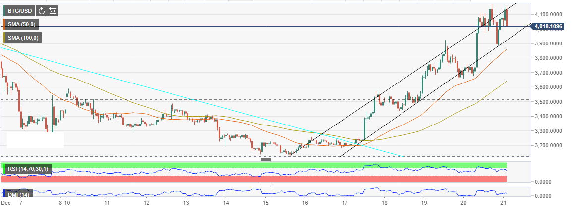 As predicted using the confluence detector tool yesterday, the path to $5,000 will be an uphill task for Bitcoin. However, it was incredible to see Bitcoin break above $4,000 resistance level. In fact, the asset formed highs close to $4,200 before correcting lower towards the close of the session on Thursday. The Asian trading hours have seen Bitcoin recover from the channel support around $3,900. BTC/USD is currently dancing within the resistance and support of the rising channel. The momentum has slowed down, besides the current trend is slightly bearish as BTC/USD heads towards the short-term support at $4,000.