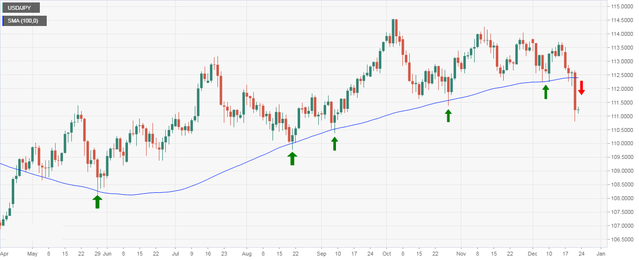 • The pair could soon explore levels below the psychological support of 110.00. The bearish outlook would be invalidated if and when the 100-day MA hurdle is scaled.