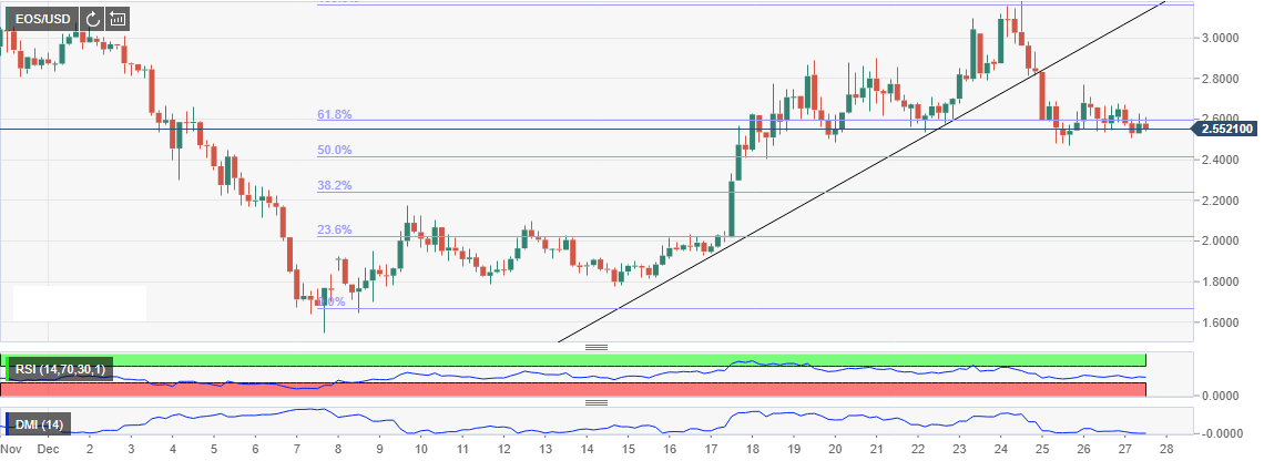 EOS explored the levels below $2 in addition to forming lows of $1.55. A correction that took effect at the beginning of the second week of December remained unstoppable above the bullish trendline. Besides, EOS/USD zoomed above $3.0 forming monthly highs at $3.16 before the bears took charge.