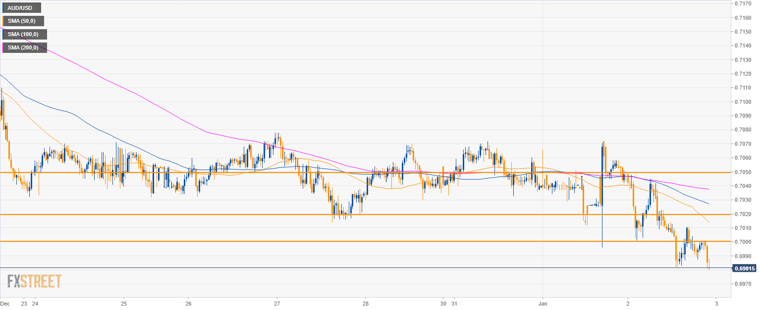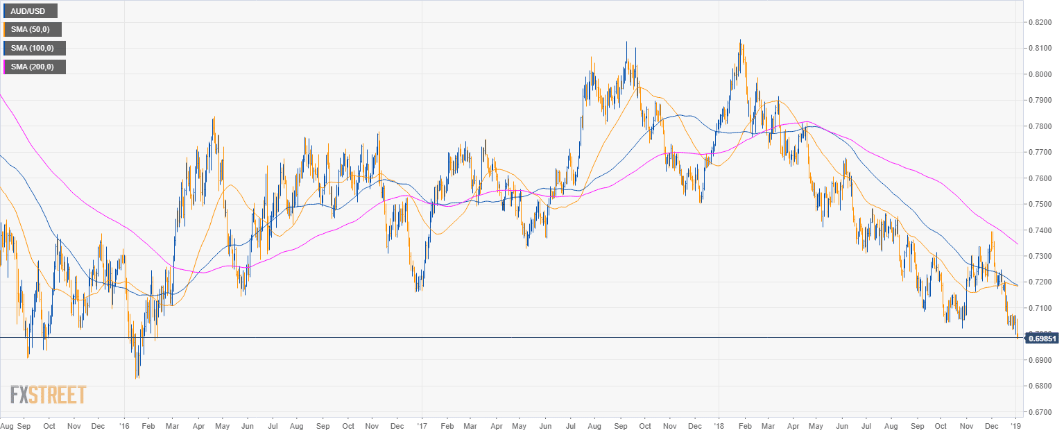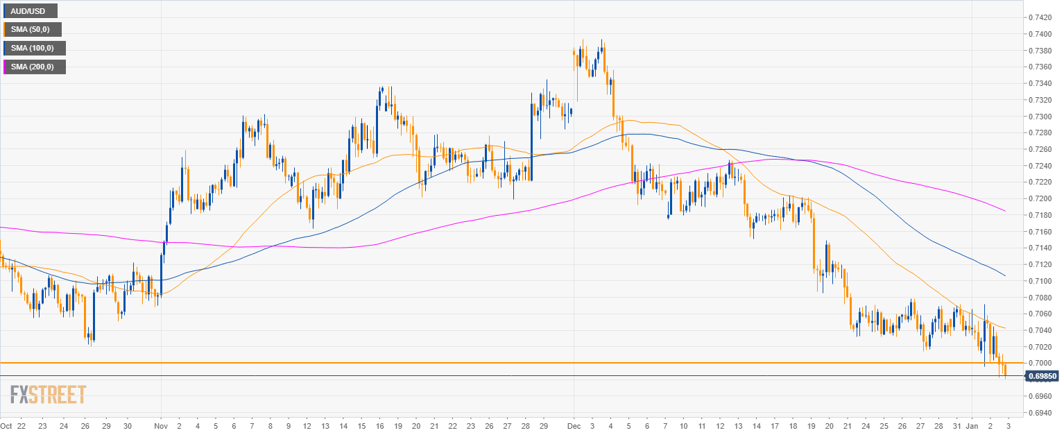 - AUD/USD is testing the 0.7000 figure, the lowest level in nearly three years.