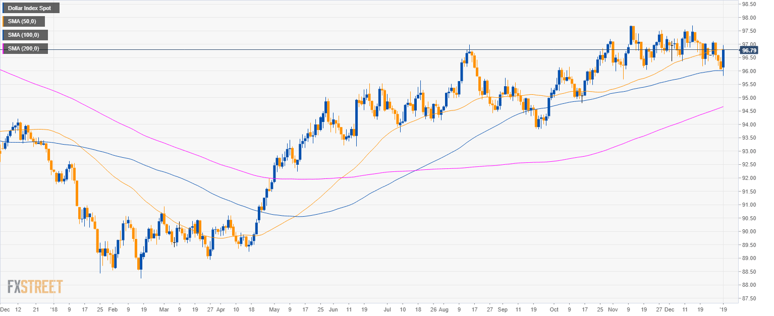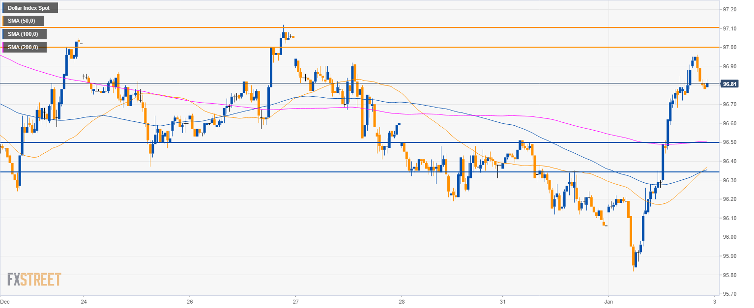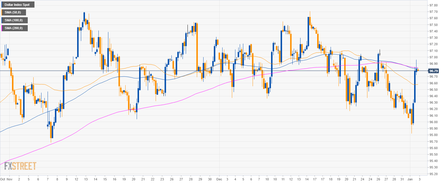 - DXY is testing the 50 SMA and the 97.00 figure.