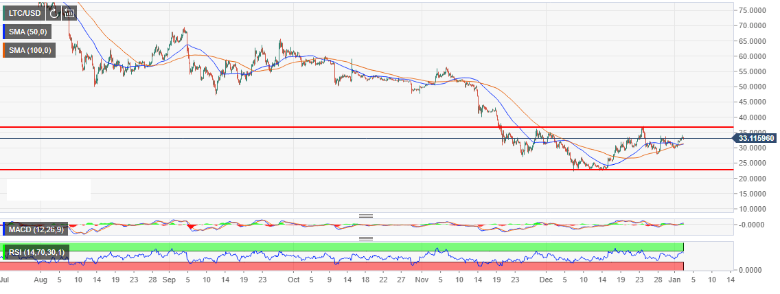 As long as the price can stay above the moving average, we could see Litecoin correct higher above the immediate resistance at $35.00. A move past the range resistance will open the road for growth above $40.00. Meanwhile $30.00 is the key support while the lows traded in December at $22.23 will continue work as the major support.