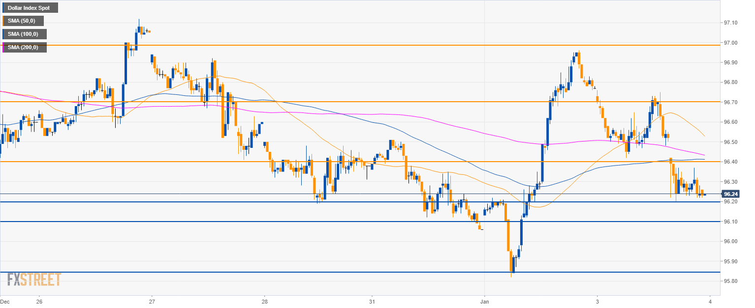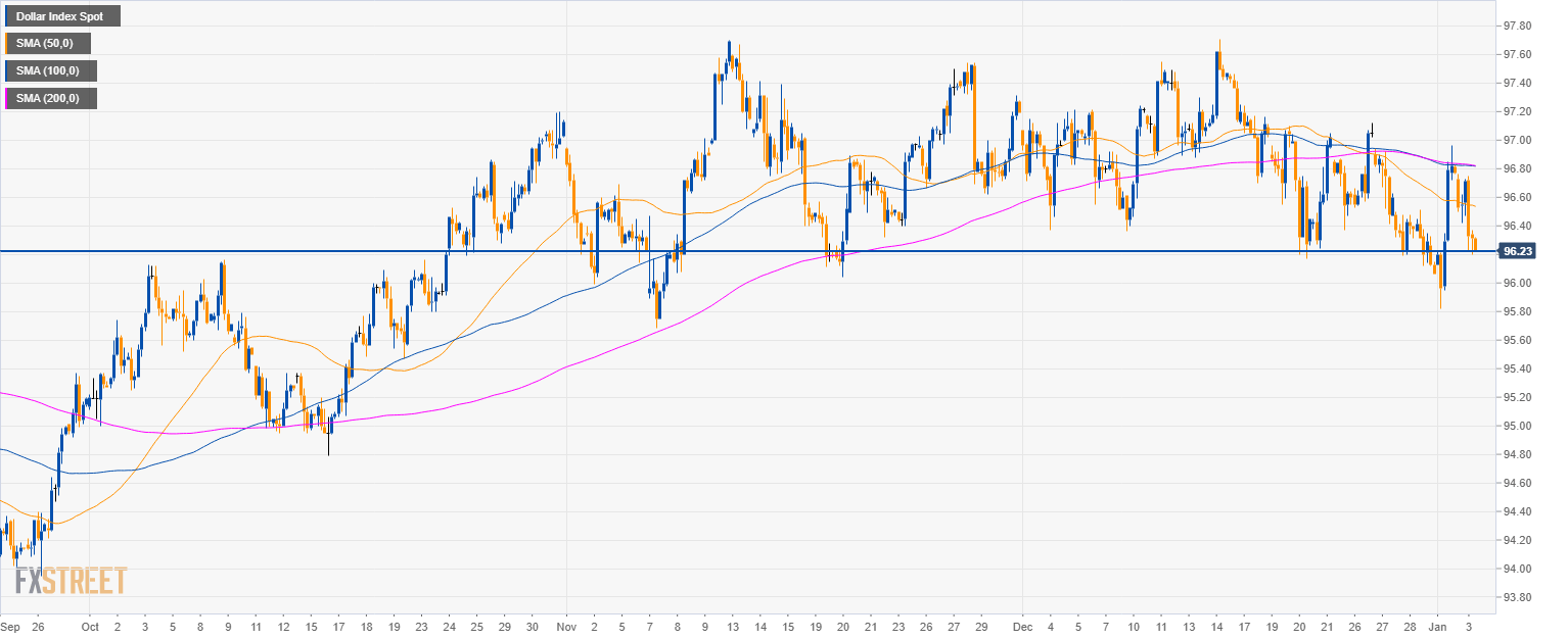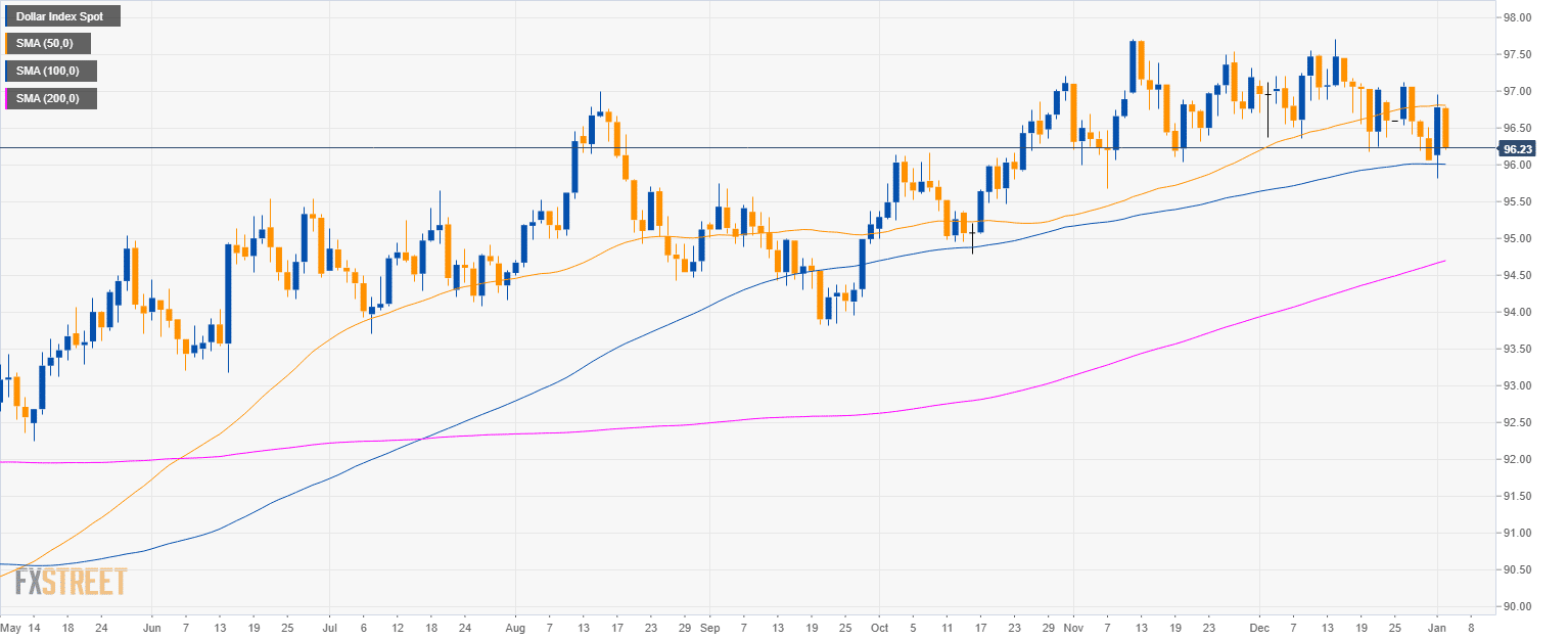 - DXY is approaching 96.00 figure and the 100 SMA on the way down.