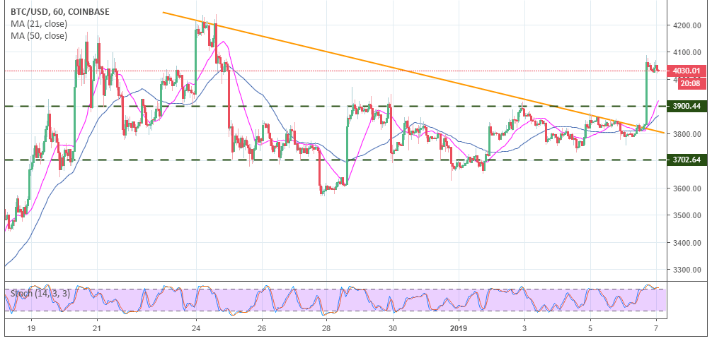 The performance of Bitcoin towards the end of last week, saw the bears break below $3,800 briefly. This move only prepared the bulls for an upward swing past the hourly Simple Moving Averages (SMA) which also coincided with the bearish trendline resistance. BTC/USD bounced broke out of the narrow bear range with an upside limit at $3,900. This also ignited movement above the psychological $4,000.