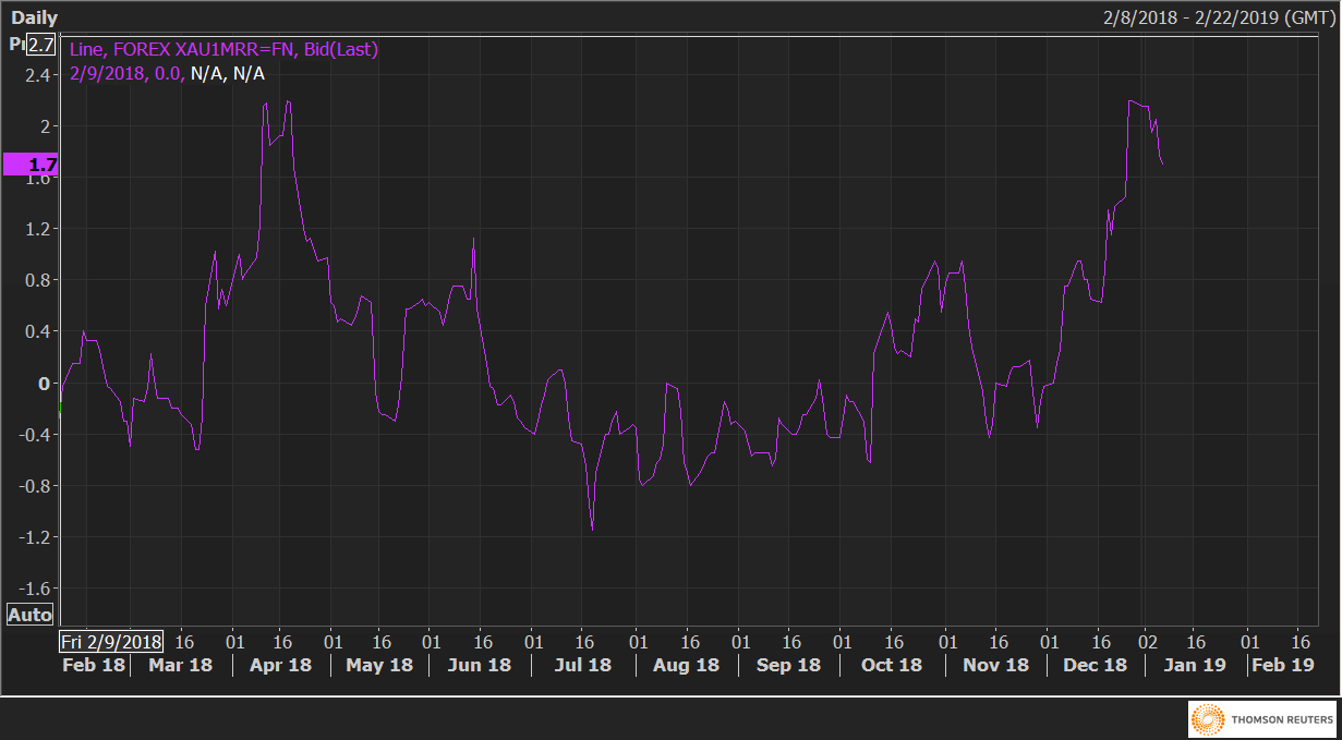 Gold one-month 25 delta risk reversals (XAU1MRR) are currently trading at 1.7 in favor of calls, having hit an eight-month high of 2.2 on Dec. 27.