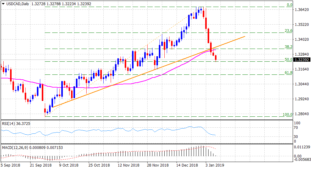 “¢   The USD/CAD pair remained under some heavy selling pressure for the fifth consecutive session and fell to over one-month lows, around the 1.3225 region on Wednesday.