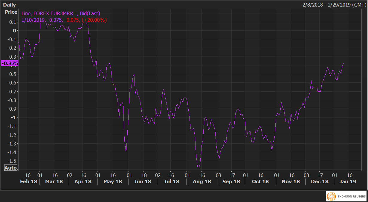 The EUR/USD three-month 25 delta risk reversals (EUR3MRR) are currently trading at -0.375 – the highest level since May. 14, 2018.