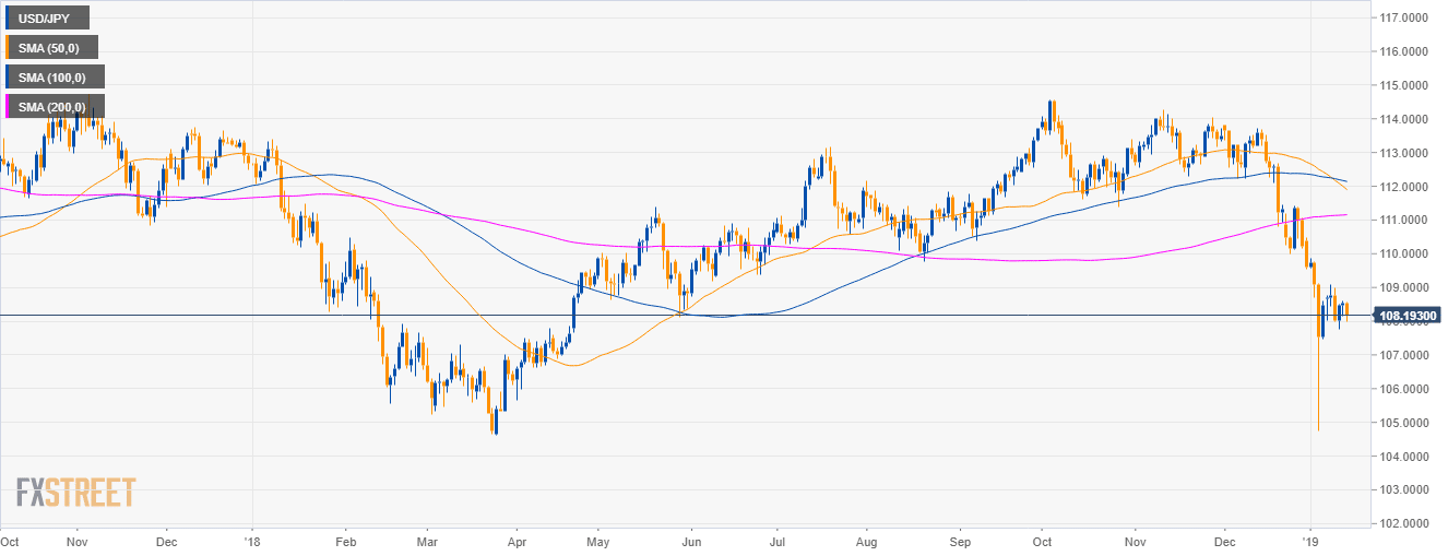 • USD/JPY is in a deep pullback below the 50, 100 and 200-period simple moving averages (SMAs).