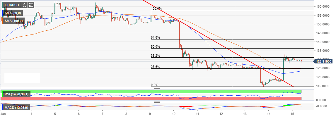Meanwhile, Ethereum is trading at $128.80 following the above-mentioned recovery. However, the trend is strongly bearish. The 38.2% Fib level resistance is proving to be an uphill task. There is a growing bearish trend on the hourly chart. Continued lower movements will find support 100-day Simple Moving Average (SMA), which currently coincides with the 23.6% Fib level. Slightly below this, the 50-day SMA currently at $123.4 will offer additional support although the major support rests at the recent low around $114.61.