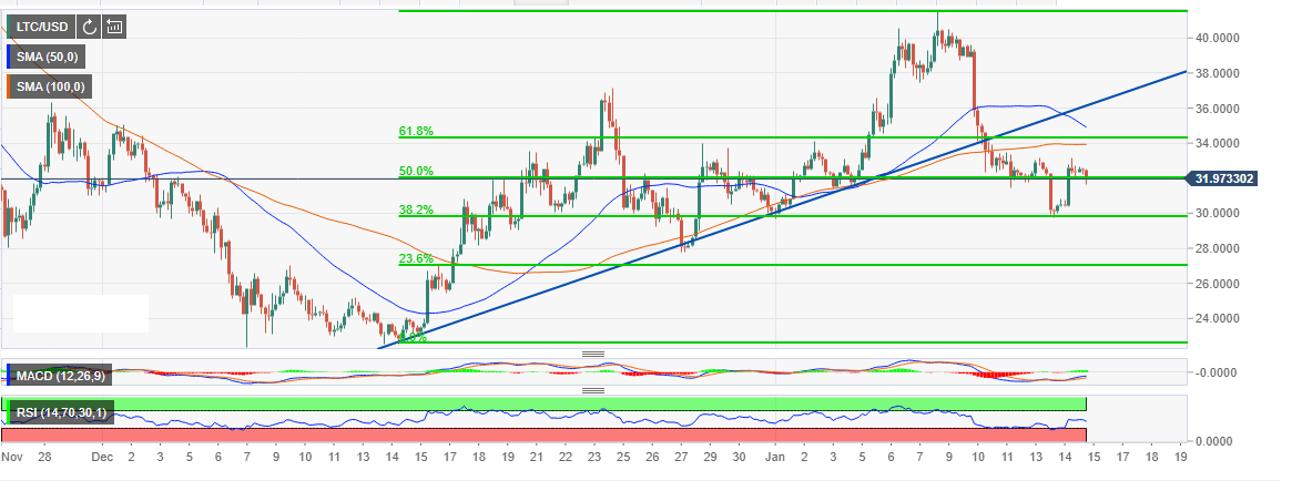 On the flipside, if the current bearish trend progresses, LTC/USD is expected to find refuge at $30.00 (38.2% Fib level). Below this level, the buyers will take solace at recent lows around $22.5.