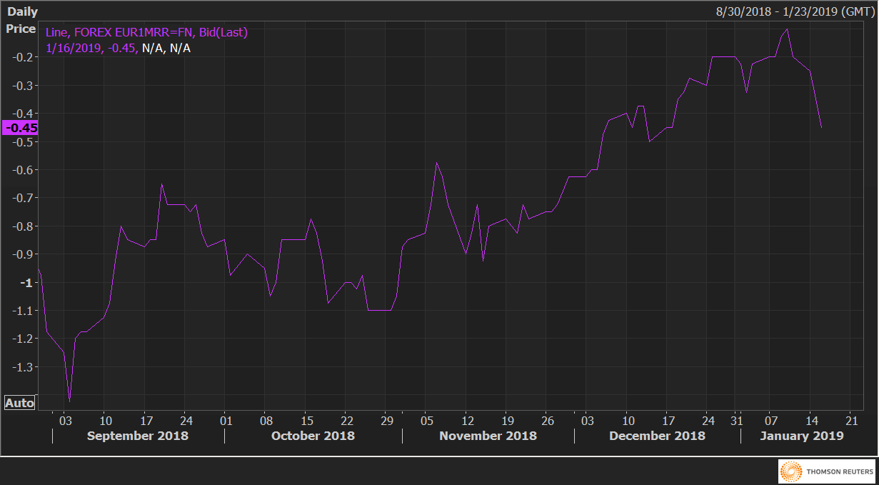 The EUR/USD one-month 25 delta risk reversals (EUR1MRR) are currently trading at -0.45 in favor of the EUR put options.