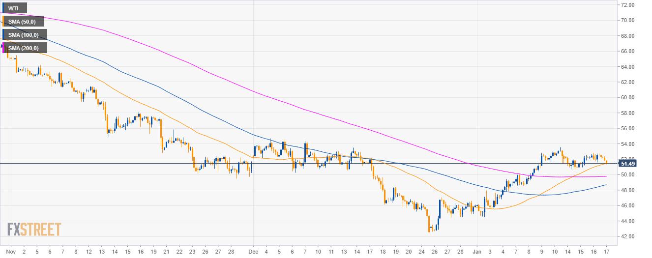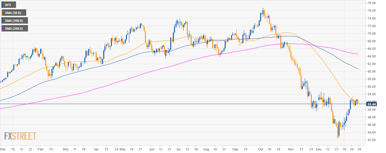 - Crude oil WTI is trading in a bear trend below the 50, 100 and 200-day simple moving averages (SMAs).