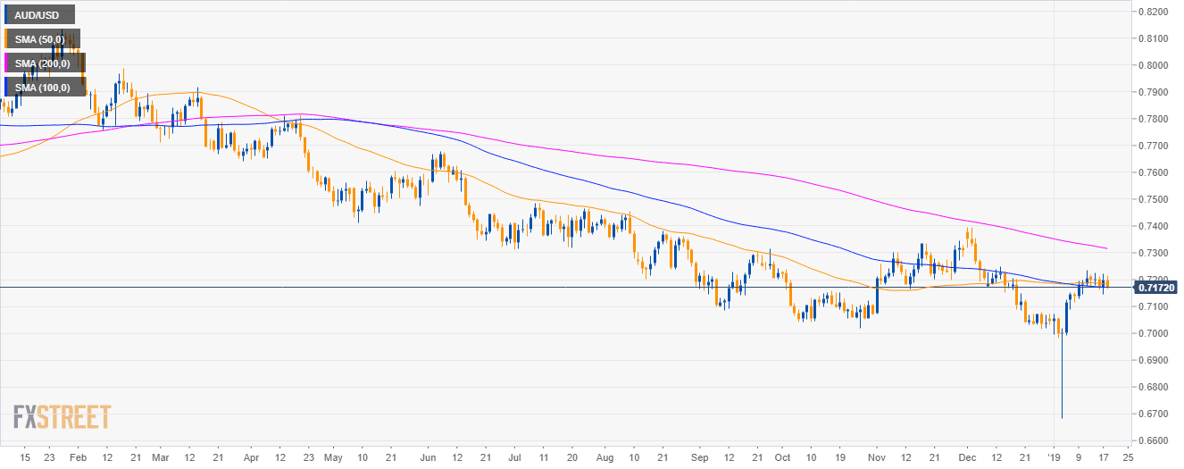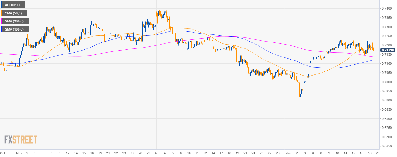 - AUD/USD is coiling near the 50 and 100 SMAs.