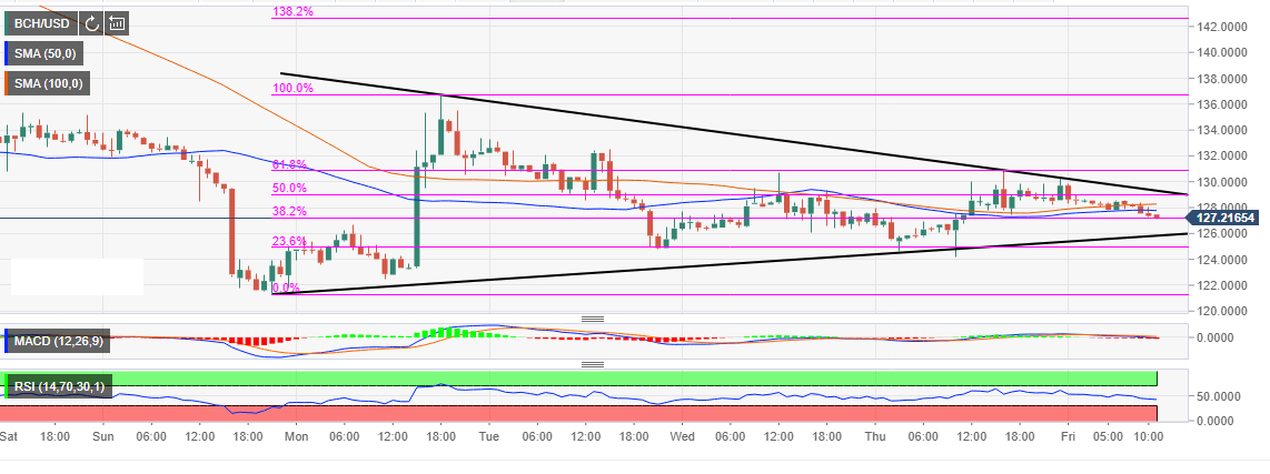 The losses have resulted in BCH/USD entering a bearish zone while testing the next support at $120. The buyers came out of the hibernation defending the support area in order to prevent continued breakdown. It formed a low around $120.5 before embarking on the current consolidation with the upside limited at $130.