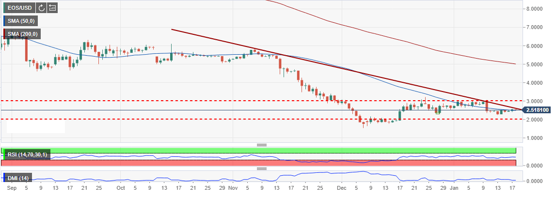 EOS has been trending in the confines of a range with the resistance at $3.0 and range support at $2.0. This sideways trending has lasted since the beginning of December last year. The resistance at $3.0 has proved to be an uphill task, besides the descending trendline is limiting the upward movements as well. The Relative Strength Index (RSI) has been horizontal above 40 since it retreated from the oversold on December 16, 2018. EOS/USD value is likely to stay in the range throughout this weekend’s trading sessions.
