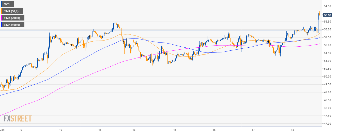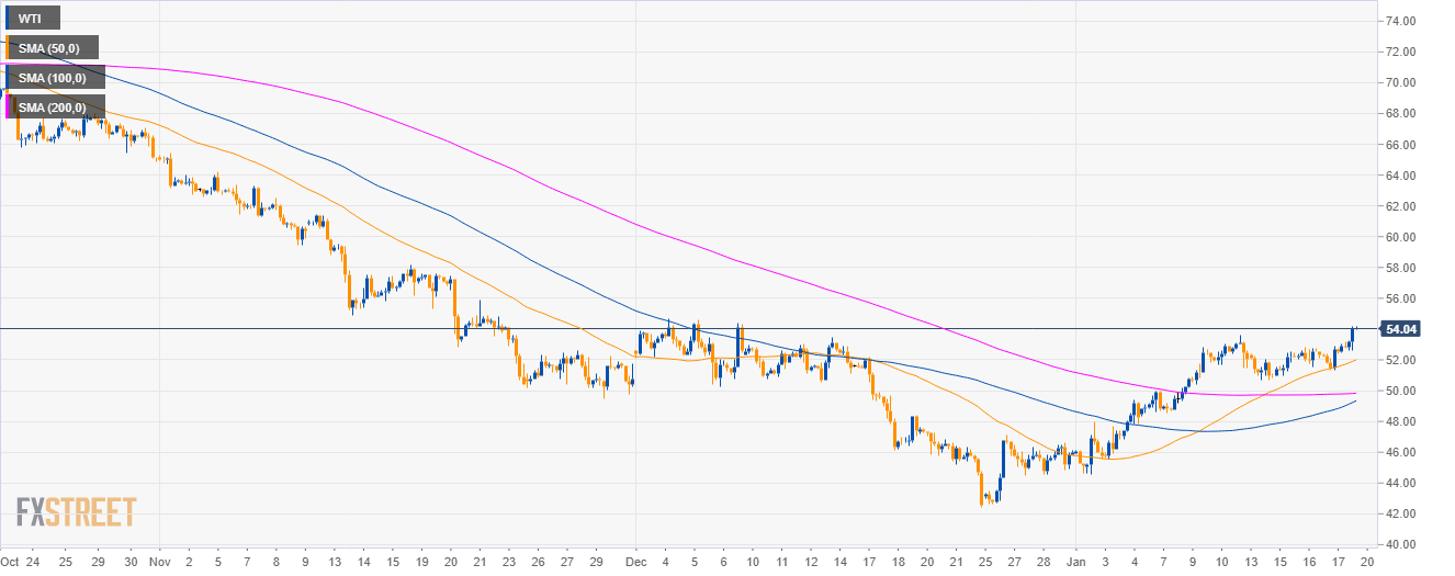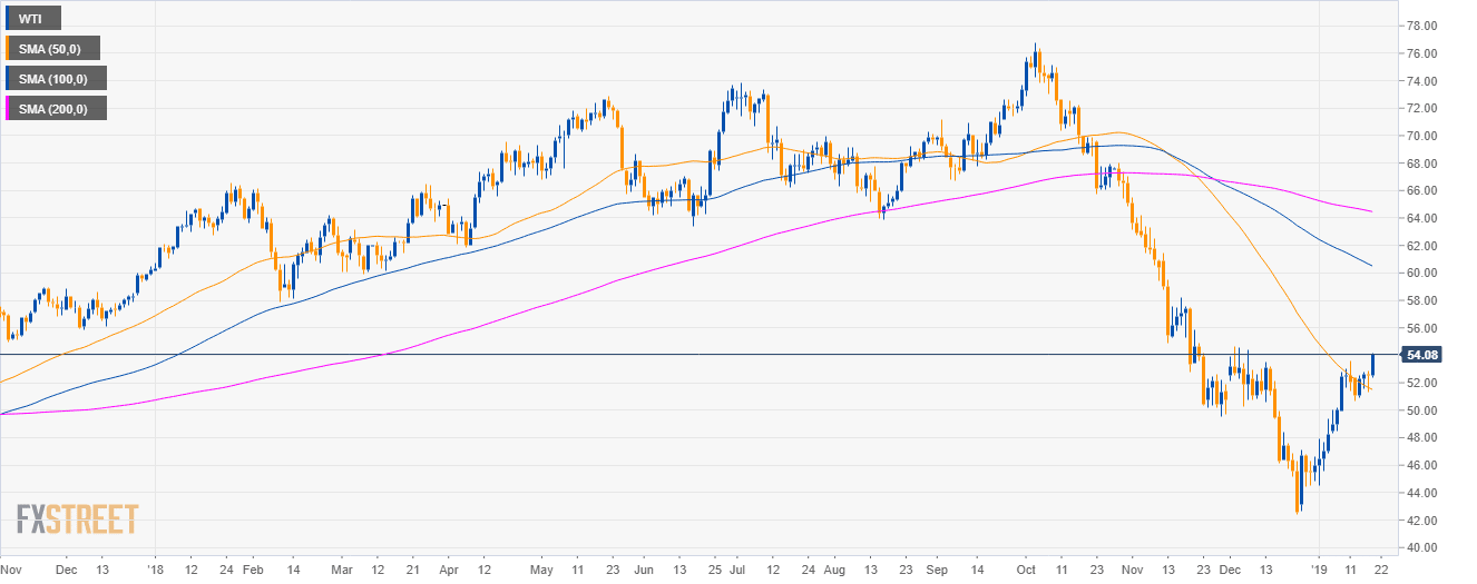 - WTI is challenging the 54.00 figure as bulls are trading at the highest point since the start of 2019.