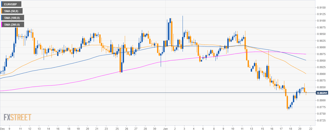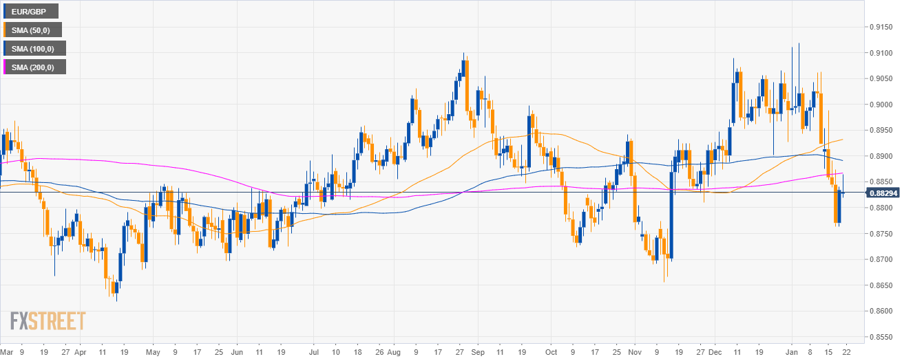 • The EUR/GBP currency cross is trading below its main SMAs while bulls recaptured the 0.8800 figure.