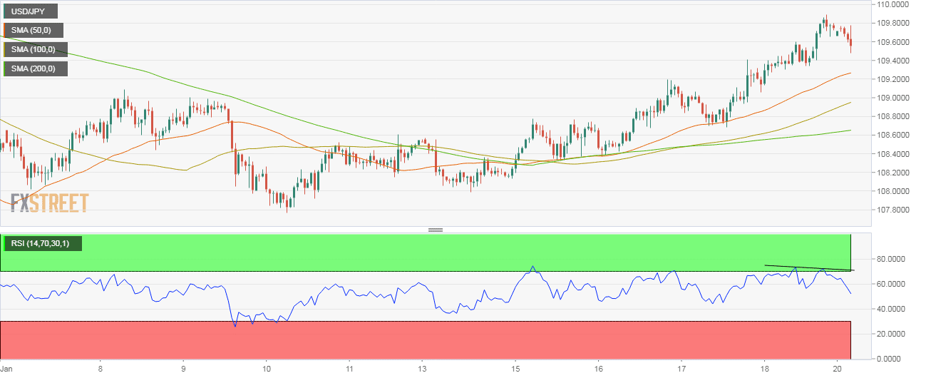 The USD/JPY pair is currently trading at 109.56 – down 0.18 percent on the day – and could drop further toward the ascending (bullish) 5-day moving average (MA), currently at 109.26, courtesy of the bearish divergence of the 14-hour relative strength index (RSI).