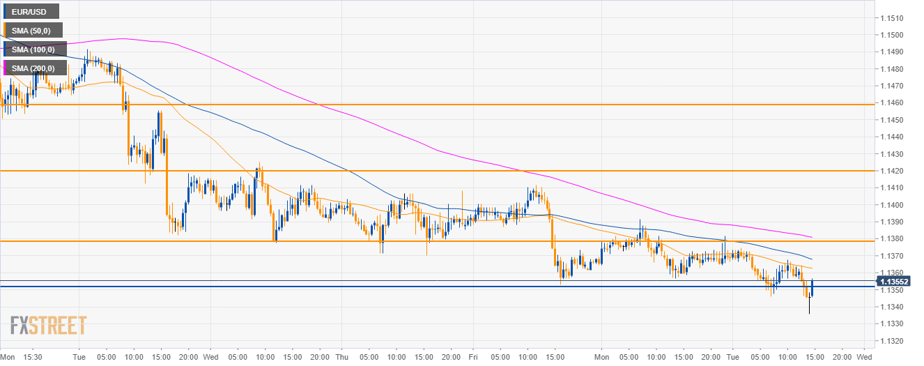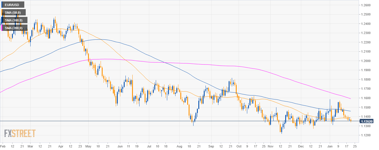 - EUR/USD is trading in a bear trend below its 200-day simple moving averages (SMA) on the daily chart.