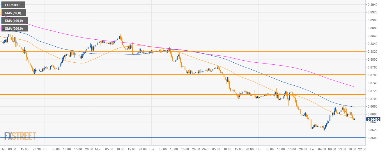 - EUR/GBP is trading below 0.8650 support and its main SMAs suggesting bearish momentum.