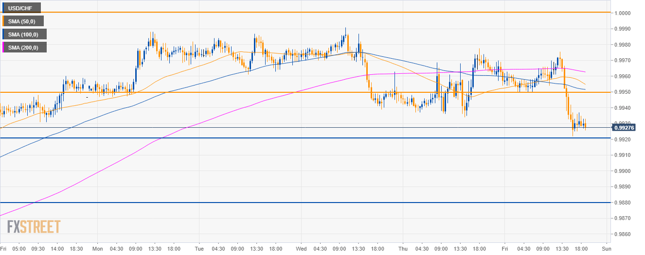 • USD/CHF broke below the 0.9950 level and found support at the 0.9920 level.
