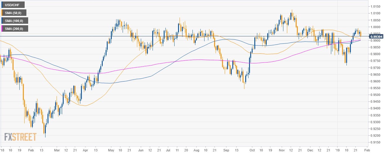 • USD/CHF is trading in a sideways trend above the 50, 100 and 200-day simple moving averages (SMAs).