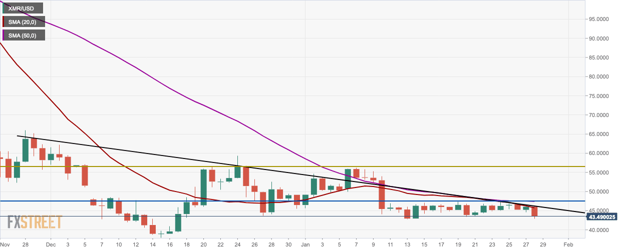 - Bears had a field day this Monday as the XMR/USD market sits dangerously on the $43 support line.