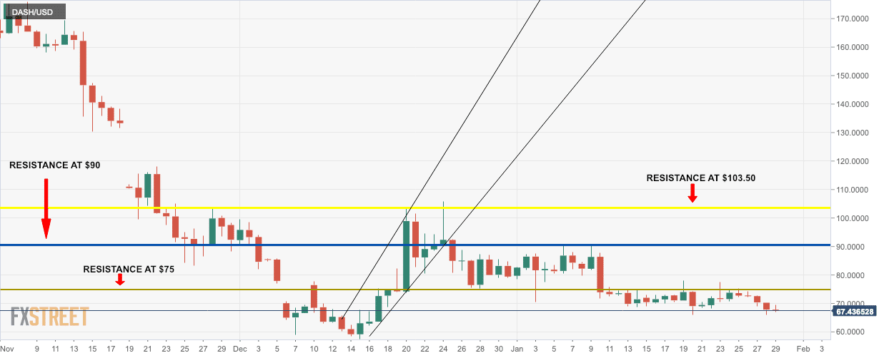 Home DASH/USD technical analysis: Bears try to take the market below $67.50 support line as the bulls try to fight back