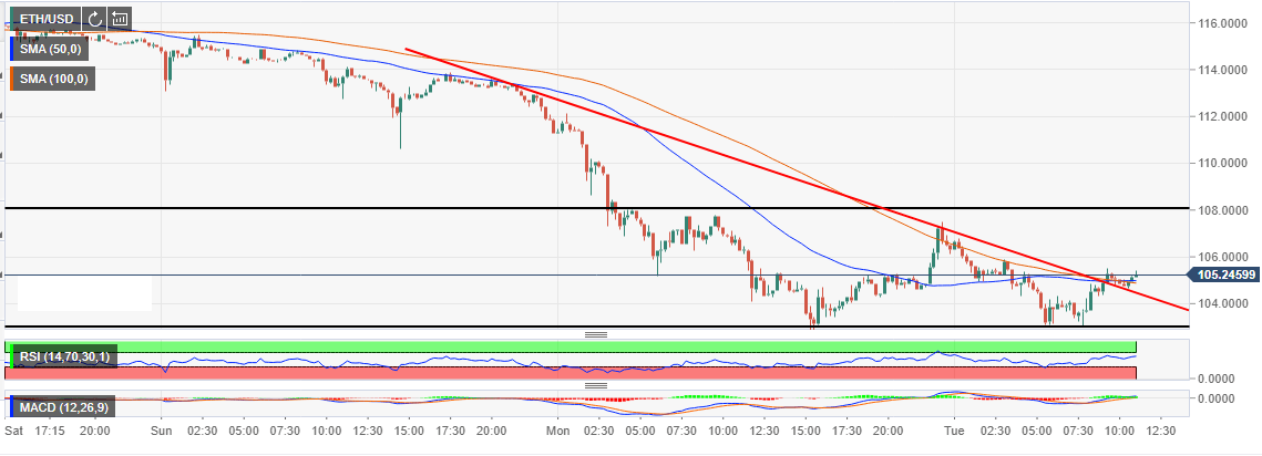 Ethereum is seen trading within a narrow range after defending the key support at $100. The current stability comes after Ethereum spend the all the sessions on Monday in the red. While the digital asset has not been able to recover from the Monday morning fall, it has made a slight progress to the upside testing the range limit at $108 severally.