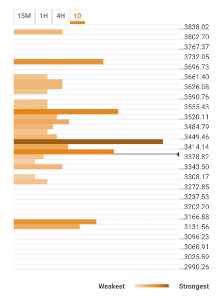 Psychological $3,400 is strengthened by a confluence of strong technical levels, including a host of short-term SMA levels. Bollinger Band 15-min both lower and middle boundary, Bollinger Band 1-day Lower.