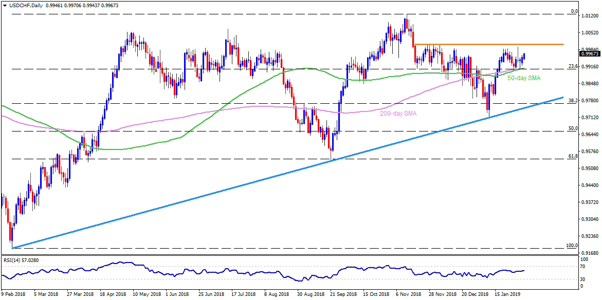 Having successfully reversed from 50-day and 200-day SMA confluence during last week, the USD/CHF is rising towards 1.0000-1.0010 horizontal-region.