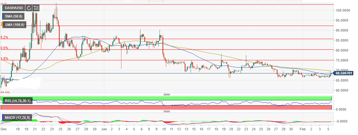 Dash has been trending lower since the highs of December 2018 that brushed shoulders with $100. The declines spilled into January continued to tumble below key support levels. Major support has been established at $65.00 and Dash trading at $68.37. It is supported by the 4-hour 50-day Simple Moving Average (SMA). At the same time, the 100-day SMA is limiting gains currently at $69.60.