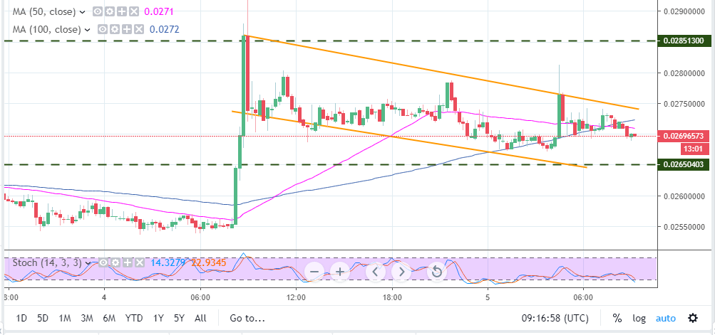 Meanwhile, TRX/USD is seen trading at $0.02689. A double cross has occurred with the 50-day Simple Moving Average (SMA) sliding below the longer term 100-day SMA to show that the bears are gaining traction. However, we expect Tron to find support at $0.02650. The high concentration of sellers will push Tron upwards. A breakout from the bullish flag pattern is approaching and will see the asset attack higher hurdles at $0.0275, $0.0280 and the critical support at $0.02851.