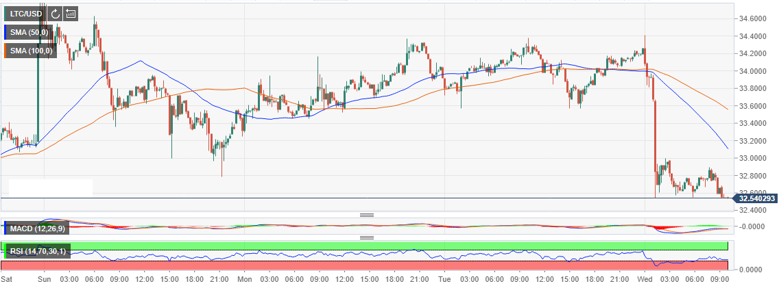 Litecoin succumbed to the bear pressure after testing the resistance at $34.40 several times since this week’s trading started Monday. While support had been established at $33.60, the drop today was unstoppable, where LTC/USD plunged below $33.00. At press time, LTC is trading at $32.54, moreover, the trend is still strongly bearish.