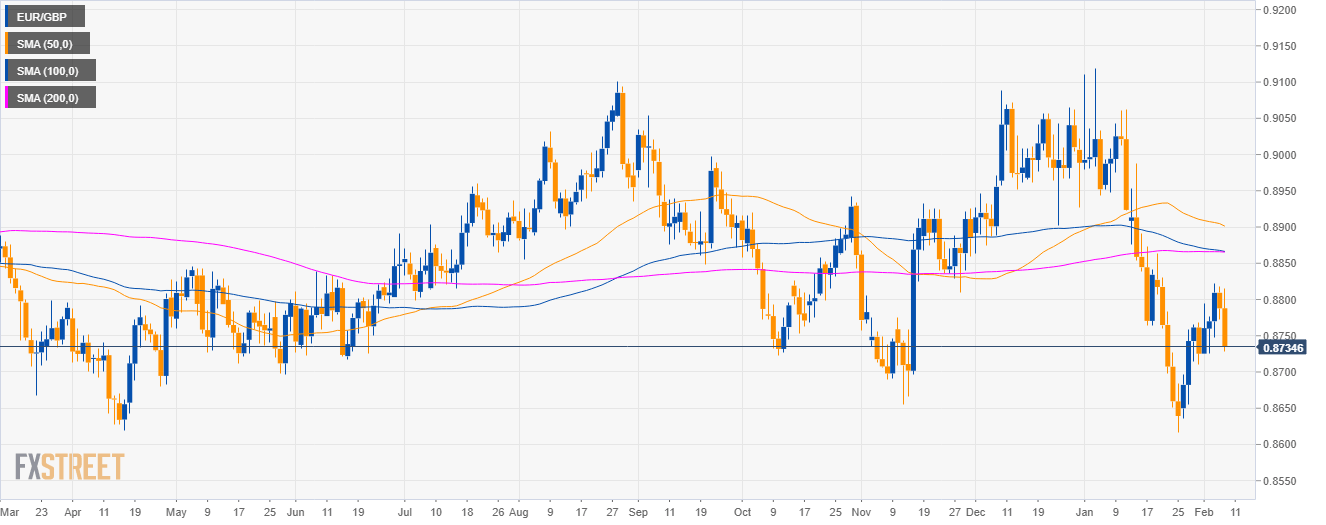 • EUR/GBP is trading in a sideways trend below the 200-day simple moving averages (SMAs).