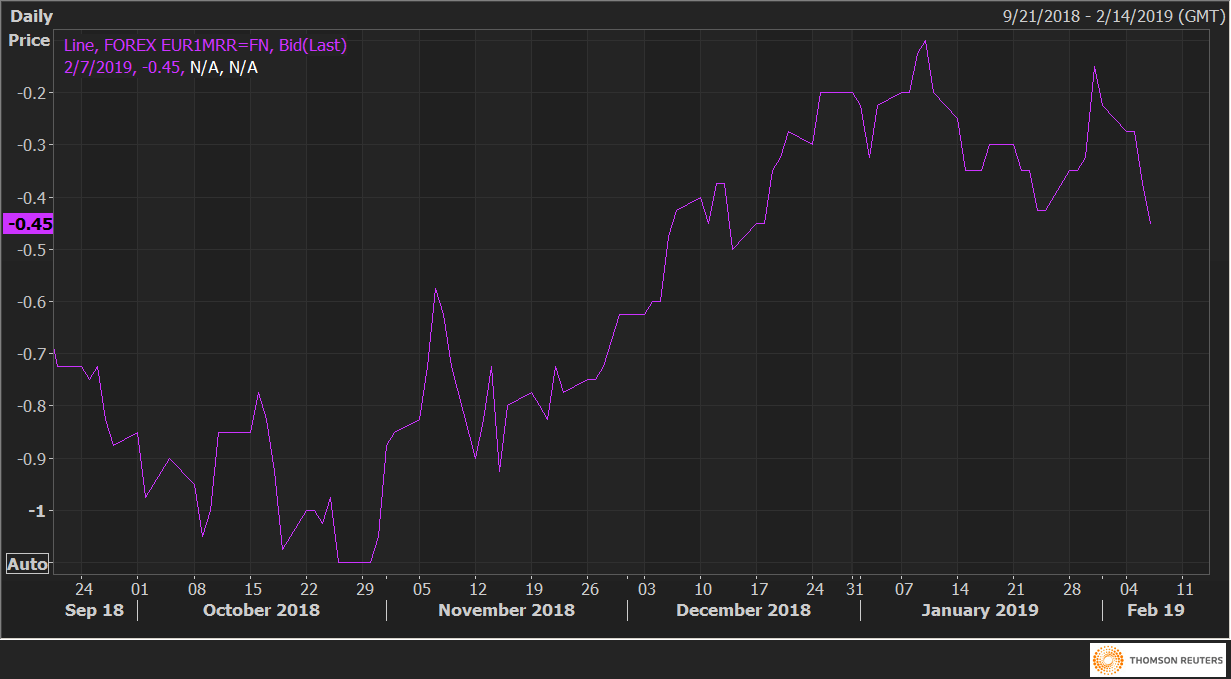 One-month 25-delta risk reversals on Euro (EUR1MRR), a gauge of puts to calls on the common currency, fell to -0.45 soon before press time, indicating the investors are buying put options – adding bets to position for weakness in the EUR.