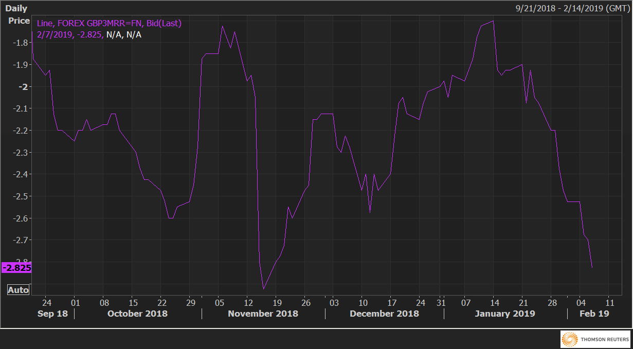 One-month 25 delta risk reversals on Sterling (GBP1MRR), which provide a measure of how much of a premium there is for GBP puts vs calls, is currently seen at -2.825; the lowest level since Nov. 16.
