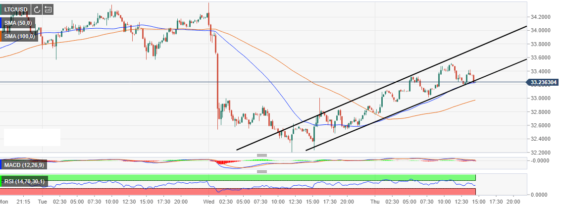At the time of press, Litecoin is trading at $33.28 after 1.49% rise on the day. The declines yesterday found support at $32.40. An attempt to recovery has failed short of $33.60. Litecoin is supported by the 50-day Simple Moving Average (SMA) marginally above $32.20.