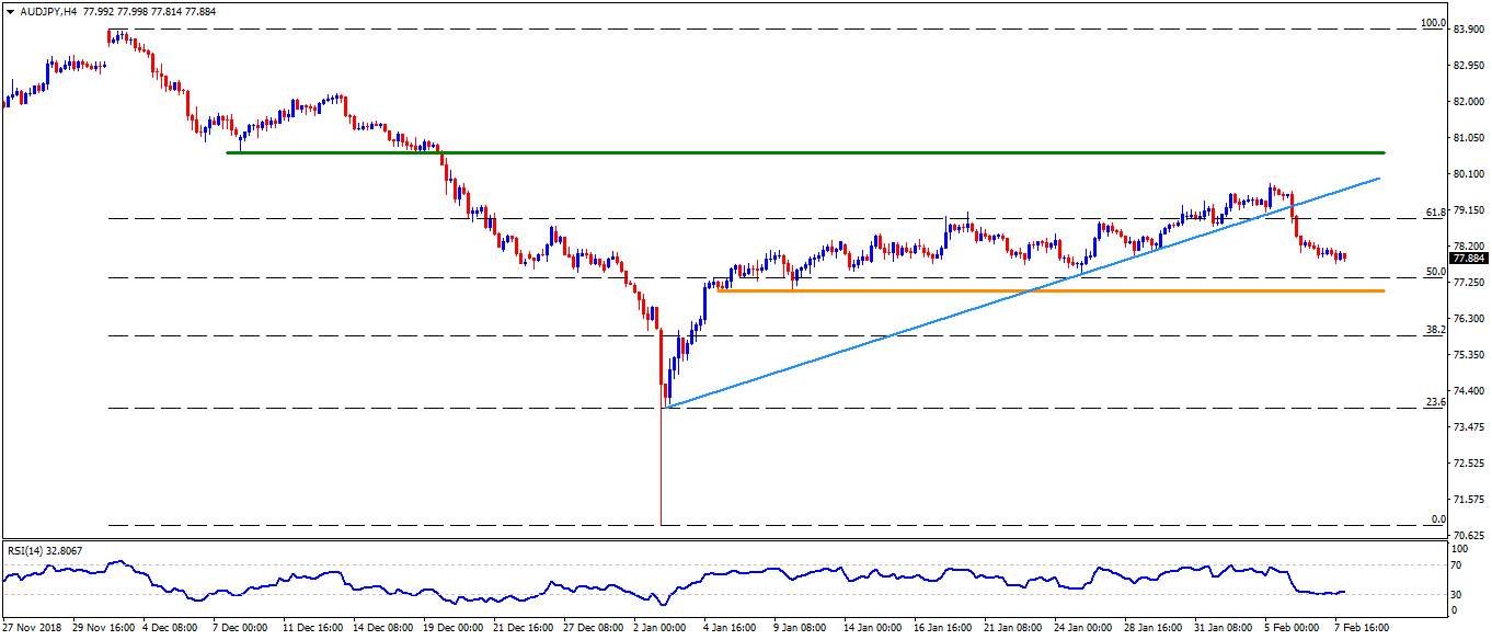 - The AUD/JPY pair extends break of month-long ascending support-line by trading around 77.85 on early Friday.