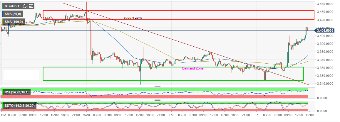 The lower correction managed to find support at $3,344.12. However, the largest digital asset by market capitalization did not stay down for long as it bounced back up during the Asian trading hours due to the high concentration of the buyers at the demand zone, see the chart below. This move gave the bulls more confidence as they rushed to increase the number of buy entries. Bitcoin resumed the uptrend above both the 15-minutes 50-day Simple Moving Average and the 100-day SMA.