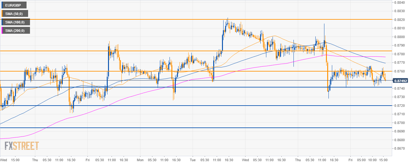 - EUR/GBP has broken below 0.8785 support and its main SMAs suggesting bearish momentum in the short-term.