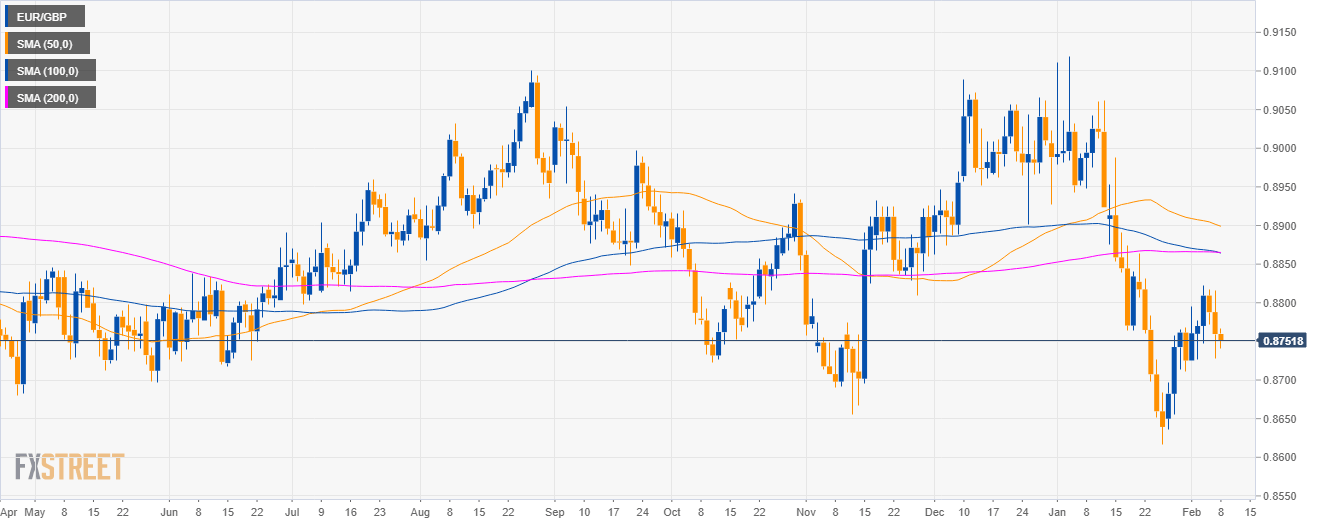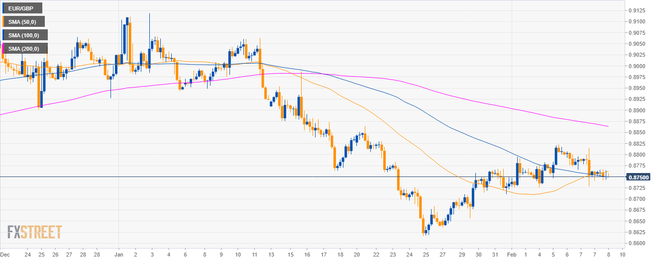 - EUR/GBP is trading between the 500 and 100 SMAs on the 4-hour chart suggesting a sideways market in the medium term.