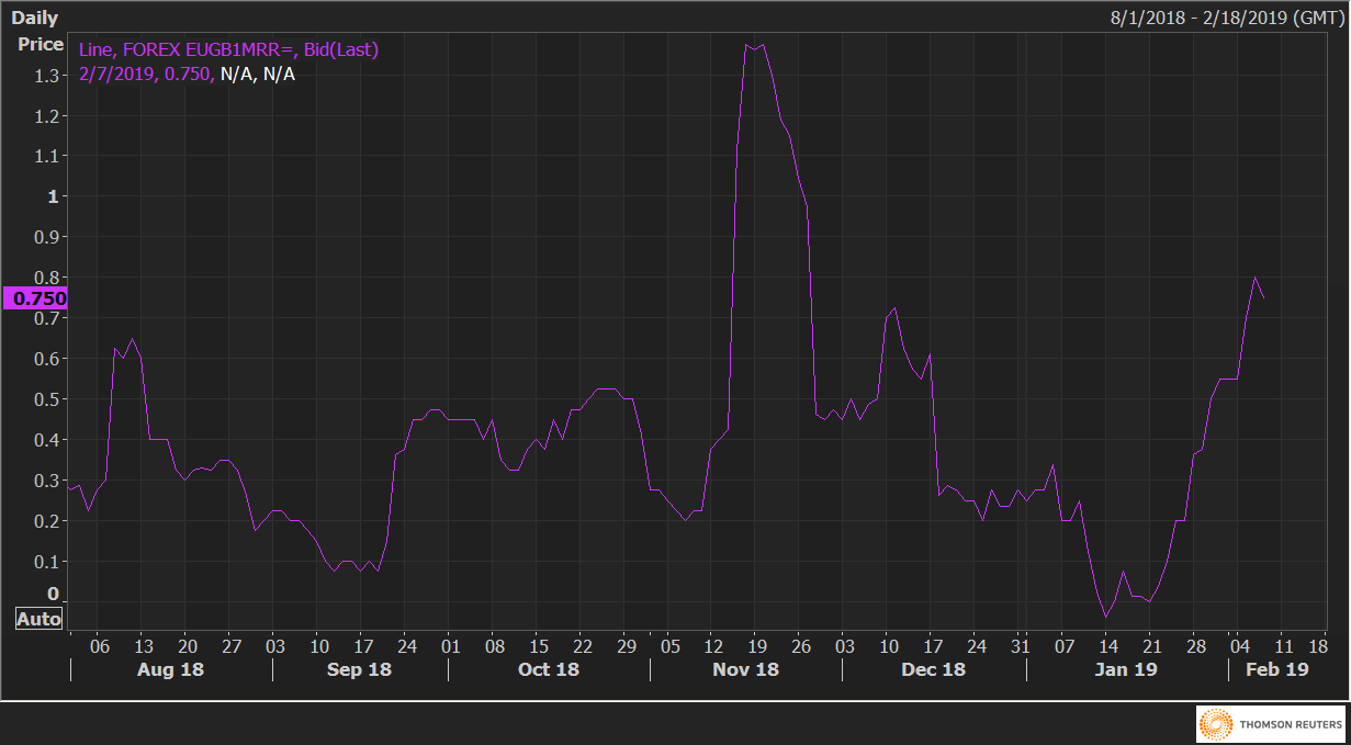 EUR/GBP risk reversals, a gauge of calls to puts, is currently trading in favor of calls (bullish bets) at 0.75 vs zero on Jan. 21. The near 90-degree rally represents a sharp rise in the demand or implied volatility premium for the call option on the EUR/GBP pair.