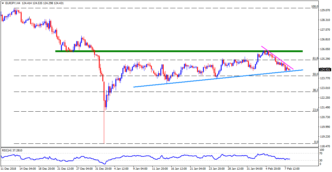 - Extending its gradual declines from 125.94, the EUR/JPY pair presently tests the short-term ascending support-line, at 124.30, on early Friday.
