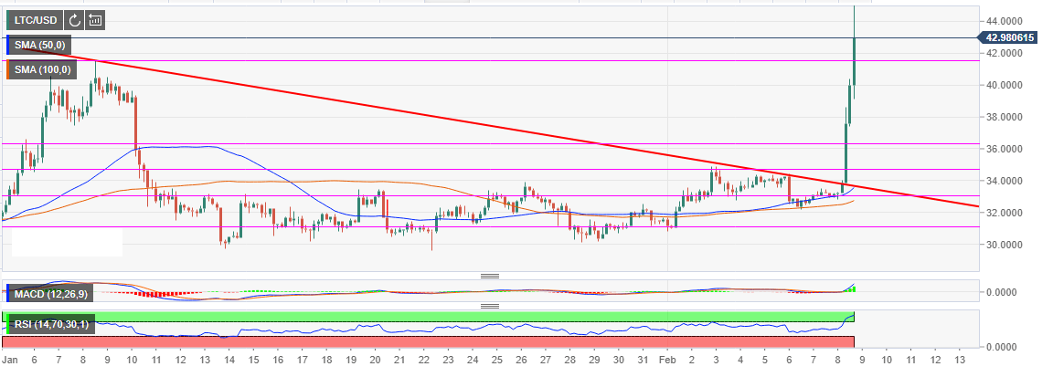 At present, Litecoin is trading at $43.058 (highest level since November 2018) up from the opening price of $33.1686. The 24-hour trading volume has increased significantly from $652 million on Thursday 7 to $1.556 billion at the time of press.
